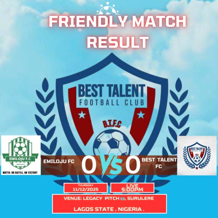Best Talent Football Club of Mowe on Thursday, 11th of December, 2025 played a drab goalless draw away from home against a Lagos based football outfit, Emiloju FC at Legacy Pitch, Surulere, Lagos.